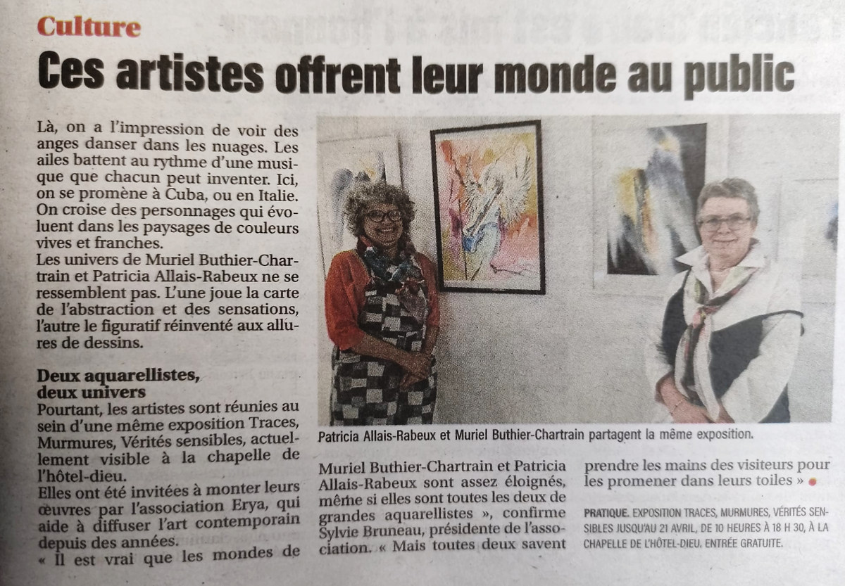 Sous le pinceau de Muriel Buthier-Chartrain et de Patricia Allais-Rabeux, l’aquarelle devient couleurs, légèreté, vibrations. Entre l’éveil et le rêve, leurs œuvres invitent à la contemplation d’un monde où l’observation se dissout dans l’eau, où la couleur s’invente à chaque regard. L’abstraction côtoie le figuratif : paysages intérieurs, fragments de réalités sensibles et souvenirs évanescents se répondent en couleurs. Le visiteur est convié à écouter le murmure de l’eau et les bruits du monde, à se laisser porter entre songes et réalités, là où l’art devient passage et poésie. “Il y a un autre monde mais il est dans celui-ci” Paul Eluard